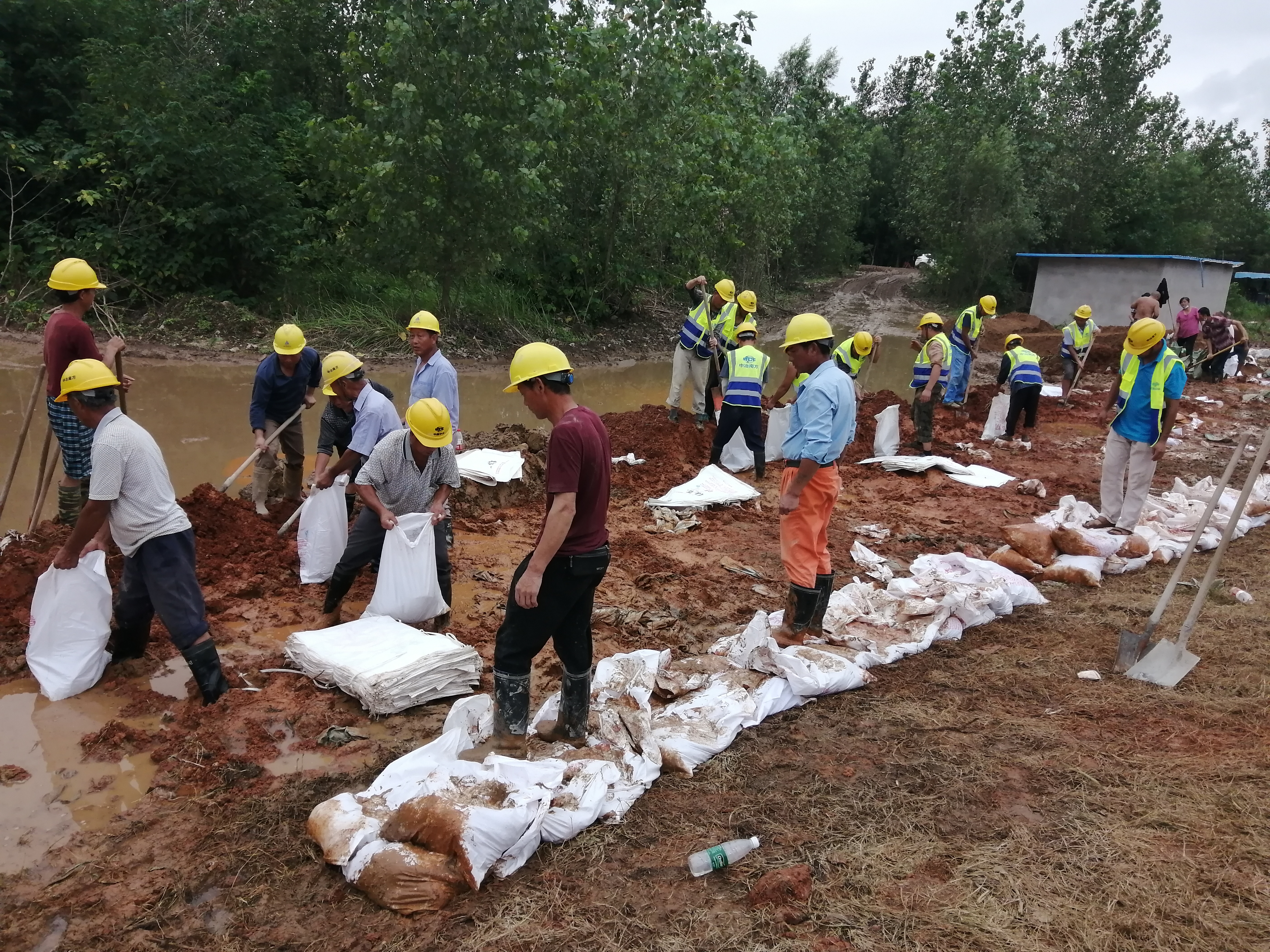 中zhong冶ye建jian工gong蕪wu湖hu市shi鳩jiu江jiang區qu新xin建jian安an置zhi房fang項xiang目mu部bu緊jin急ji成cheng立li黨dang員yuan突tu擊ji隊dui,迅xun速su支zhi援yuan當dang地di防fang汛xun搶qiang險xian工gong作zuo,堅jian決jue築zhu牢lao防fang禦yu洪hong水shui最zui後hou屏ping障zhang。根gen據ju統tong一yi部bu署shu,項xiang目mu部bu共gong集ji結jie精jing幹gan應ying急ji救jiu援yuan力li量liang53人,籌備應急救援物資包含挖掘機9台、平板拖車5輛、粉噴樁機2台、物資運輸設備2台、排澇設備8套、救援車輛11台及其他防汛物資若幹,火速趕赴蕪湖市鳩江區二壩翟灣開展堤壩搶險加固工作。在4個多小時的救援工作中,項目部防汛救援小組以人拉肩扛的方式裝袋運送1200袋防汛沙包,使堤壩鞏固加高約60公分,圓滿完成了230餘米長防洪堤壩加固任務。