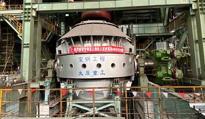 寶鋼湛江鋼鐵三高爐係統項目煉鋼工程是在一期已建3座350噸轉爐的基礎上再新增350噸轉爐。此350噸轉爐目前為全國最大轉爐,轉爐上部爐殼重231噸、直徑8.6米、高7.4米,托圈重275噸、直徑10.8米、高2.8米,下部爐殼重110噸、直徑8.6米、高4.4米。項目竣工後,寶鋼湛江鋼鐵煉鋼廠將成為全球最大的單體煉鋼車間,年產鋼水達1253萬,年產鋼坯達1235萬噸,人均達2500噸鋼/年。