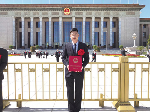 圖為手捧獲獎證書的徐鍾園在人民大會堂前留影。
