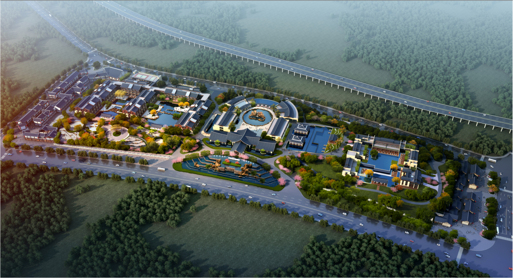 月亮莊項目總建築麵積78832.51平方米,容積率0.55,建築密度21.44%,綠化率為56.67%,停車位342個,由酒店大堂、花園客房、宴會廳、多功能廳、特色餐廳、商務套房、臨街商業等共計29棟建築組成。其中花園客房標間159套,單間83套,商務套房24套,總統套房1套,可容納458人入住;會議室5個,能召開14人至500人的各類會議,宴會廳能容納450人用餐。項目共分為三個區域,第一個區域是花園客房、臨街商業、婚慶廣場;第二個區域是酒店大堂、宴會廳、多功能會議廳、特色餐廳;第三個區域是商務套房、總統套房。