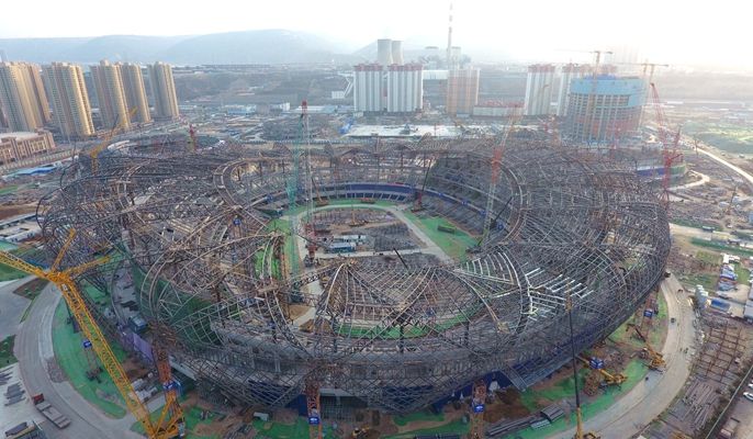 12月18日ri,中zhong國guo十shi七qi冶ye集ji團tuan承cheng建jian的de蘭lan州zhou奧ao體ti中zhong心xin項xiang目mu體ti育yu場chang罩zhao棚peng鋼gang結jie構gou內nei環huan桁heng架jia順shun利li合he龍long,標biao誌zhi著zhe蘭lan州zhou奧ao體ti中zhong心xin項xiang目mu體ti育yu場chang工gong程cheng又you一yi裏li程cheng碑bei節jie點dian完wan成cheng。