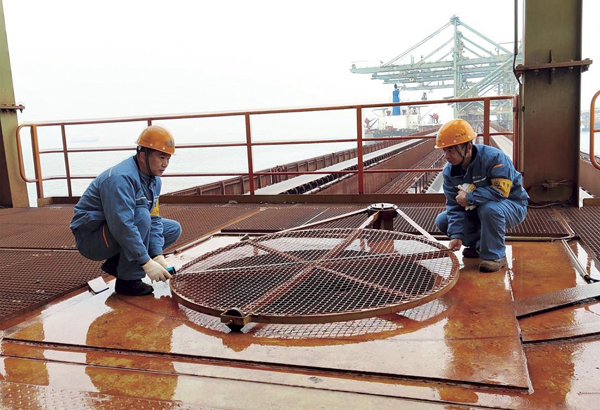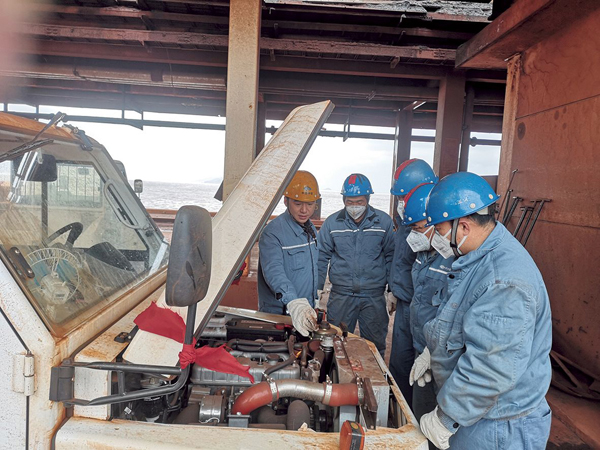 圖為李偉偉(左一)正與同事在檢查碼頭設備。