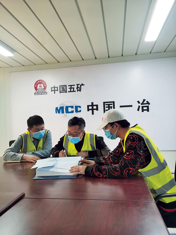 圖為張建都(中)與項目管理人員正在討論疫情防控方案。