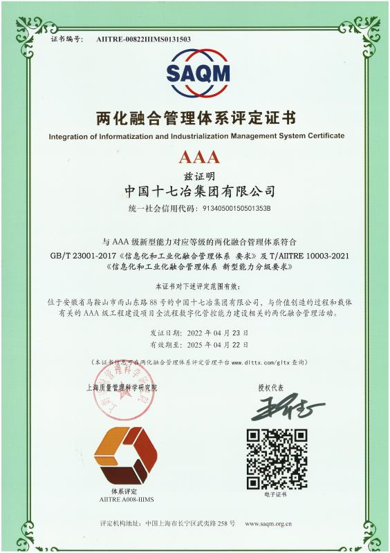 6月15日,中國十七冶集團收到國家工信部頒發的兩化融合最高等級AAA級證書,成為安徽省首個通過兩化融合管理體係AAA級評定的建築業企業。