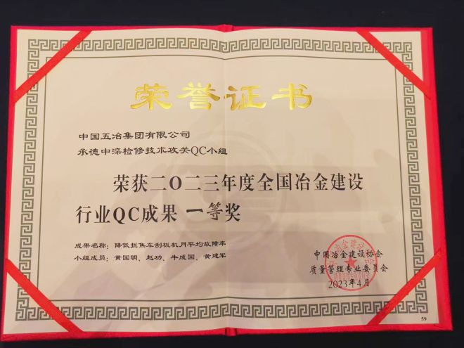 近日,中國五冶集團工程技術服務分公司承德中灤檢修技術攻關QC小組發布的《降低攔焦車刮板機月平均故障率》在“2023年度冶金建設行業質量管理交流活動”中榮獲QC成果一等獎。
