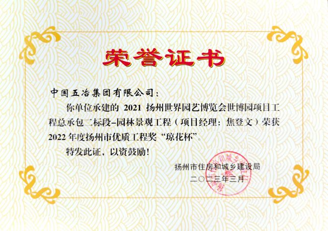 近日,2022年度揚州市優質工程獎獲獎工程名單出爐,中國五冶集團承建的2021揚州世界園藝博覽會世博園項目園林景觀工程榮獲2022年度揚州市優質工程獎“瓊花杯”。