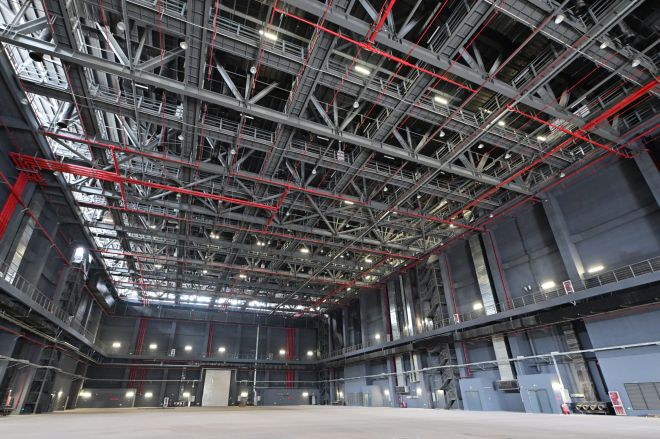 攝影棚主體結構形式為框排架結構,大跨度鋼桁架跨度超過36米,且每棟攝影棚內部都有兩層馬道(攝影平台),懸挑2.06-3.4米不等,高度超過8米,分部分項工程危險性較大,施工難度高。同時,施工場地工程布置緊湊,大型起重機吊裝受到限製,項目建設者們用“瓷器店裏捉老鼠”描述自己的工作。