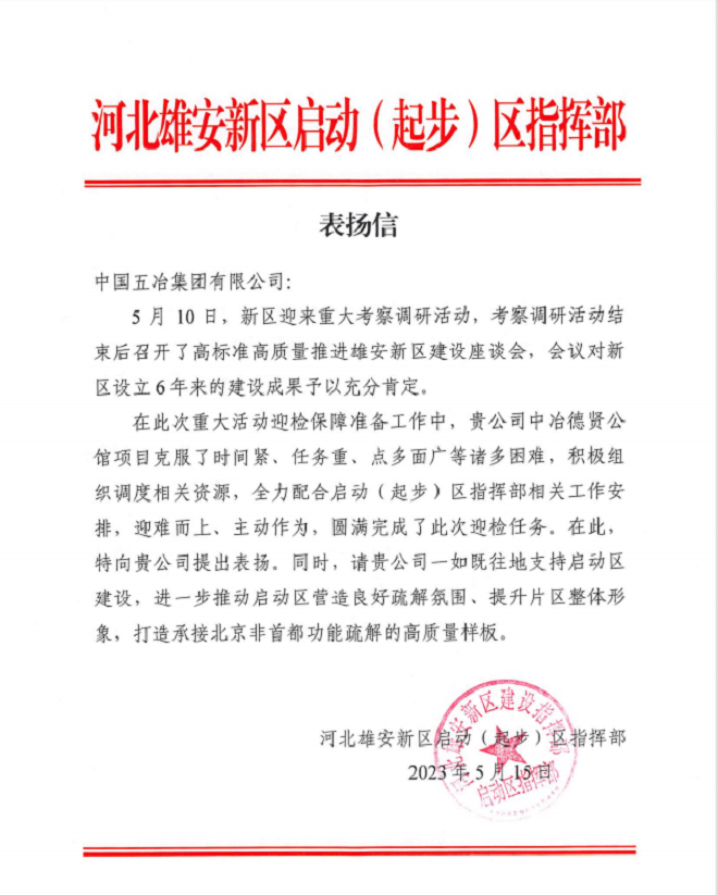 5月15日,中國五冶集團河北雄安啟動區西南居住片區一期項目收到雄安新區啟動(起步)區指揮部表揚信。