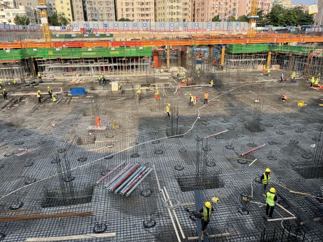 自開工以來,項目累計開挖地下土方量約156000立,樁施工1700多根,底板澆築約12600平,累計澆築混凝土約11000立,支護施工三軸攪拌樁132幅,咬合樁337根,排樁131根,立柱樁62根。項目基坑最深為14.4米,最大底板約3350平,混凝土約3100立。