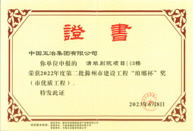 近日,滁州市住房和城鄉建設局公布2022年度第二批滁州市“琅琊杯”優質工程獎名單,中國五冶集團承建的清琅別院項目榮膺在列,光榮上榜。