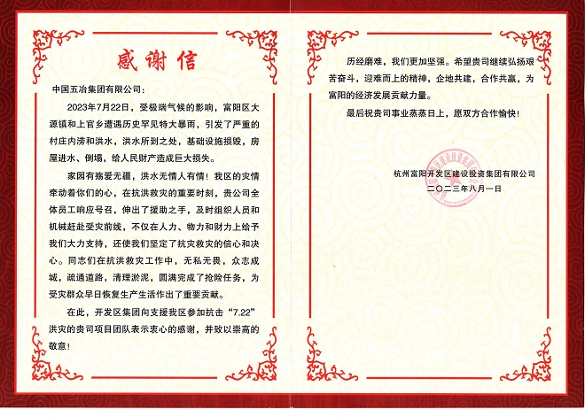 近日,杭州富陽開發區建設投資集團有限公司向中國五冶集團發來感謝信,對中國五冶集團項目團隊在抗擊“7.22”富陽洪災期間的大力支持和無私援助表示衷心感謝並致以崇高敬意。
