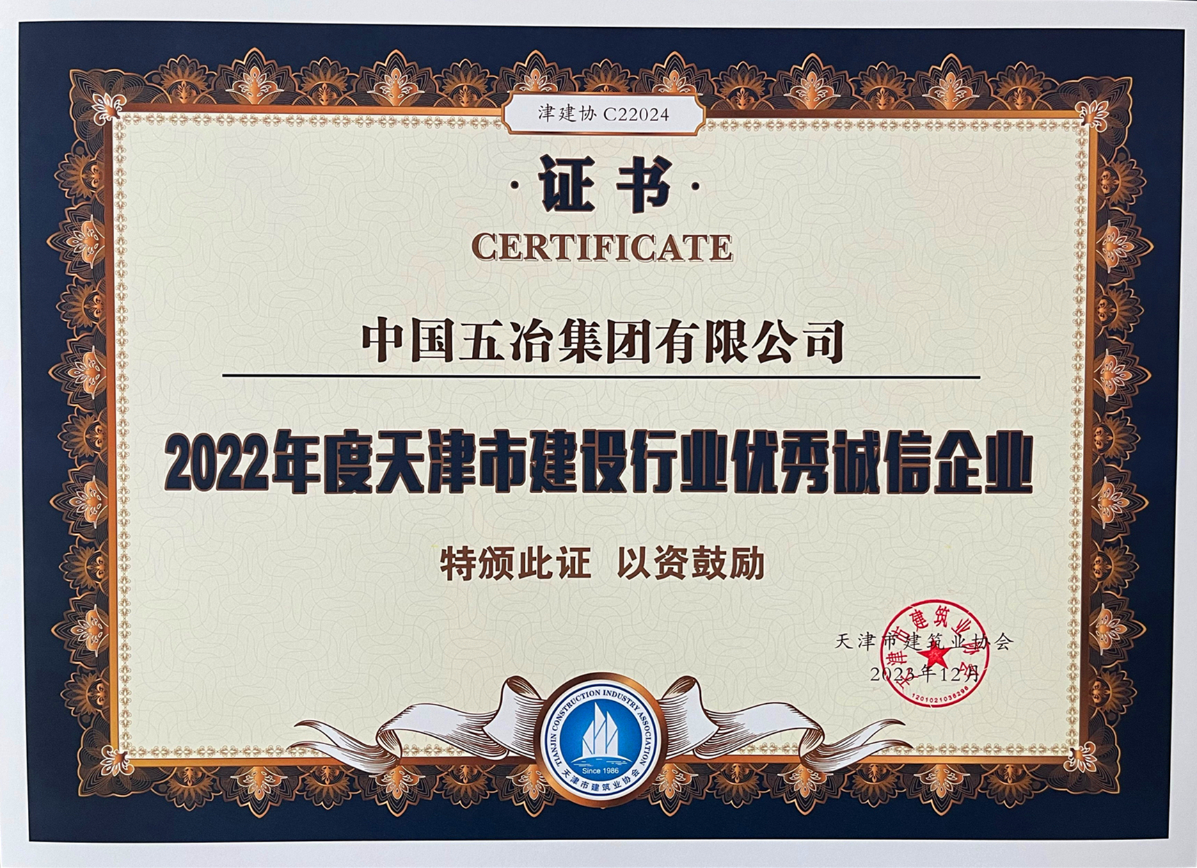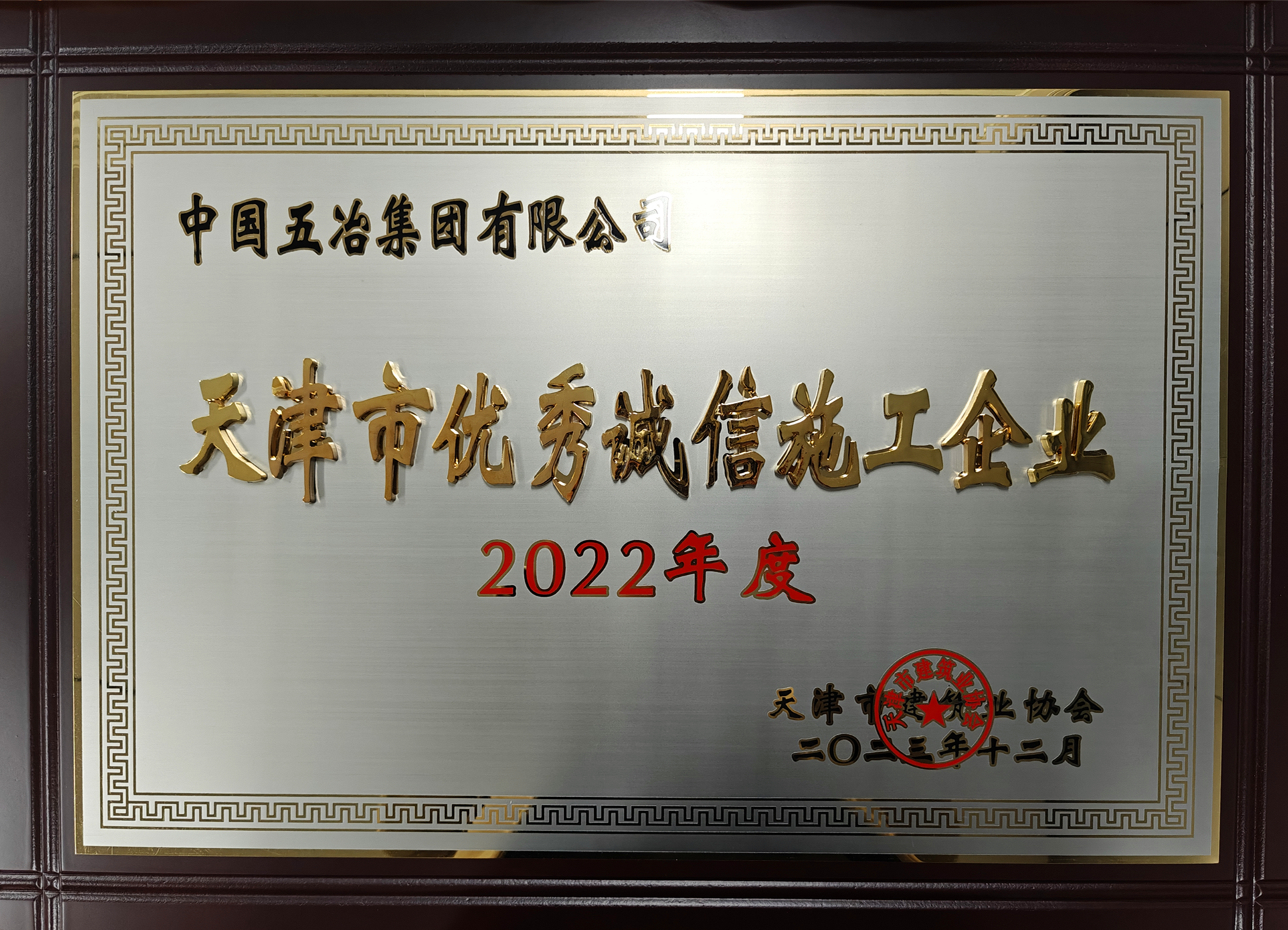 近日,中國五冶集團獲得“2022年度天津市優秀誠信施工企業”獎牌和“2022年度天津市建設行業優秀誠信企業”證書,這是公司連續第三個年度獲得這兩項榮譽。