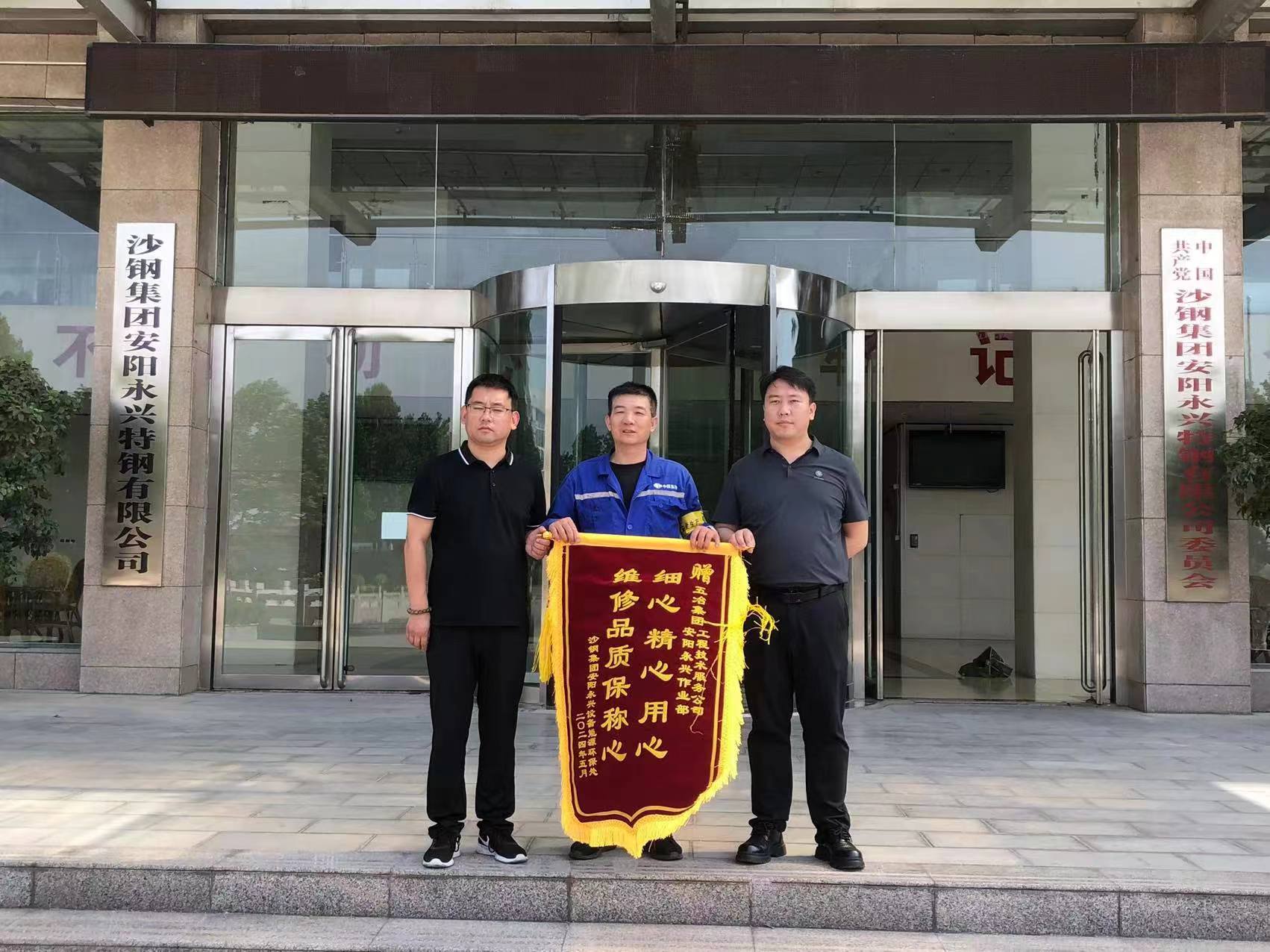 “細心、精心、用心,維修品質保稱心”,表揚信和錦旗是對作業部“以服務客戶為己任,以客戶滿意為宗旨”的認可和肯定,也是對未來更好地開展工作的激勵,接下來,作業部全員將再接再厲,踐行初心使命,勇於擔當奮進,為公司與沙鋼集團永興特鋼有限公司進一步深化合作奠定堅實基礎。(魏冉 文/圖)