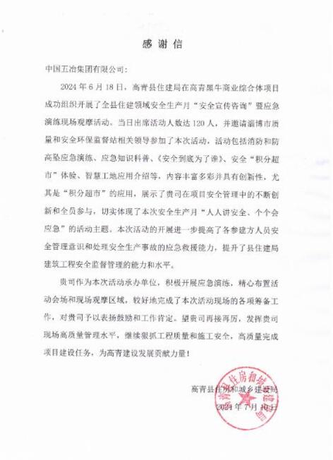 信中指出,高青縣住建局在高青黑牛商業綜合體項目成功舉辦了全縣住建領域安全生產月“安全宣傳谘詢”暨應急演練現場觀摩活動。中國五冶作為本次活動的承辦單位,展現了其在項目安全管理方麵的卓越實力。本次活動內容豐富多樣,涵蓋了消防和防高墜應急演練、應急知識科普、安全“積分超市”體驗以及智慧工地應用介紹等環節。特別值得一提的是,項目團隊在“積分超市”的應用上進行了創新,充分展示了公司在項目安全管理中的全員參與和不斷創新的精神。這一舉措不僅提高了參與人員的安全管理意識和應急救援能力,為提升縣住建局建築工程安全監督管理能力和水平做出了積極貢獻。