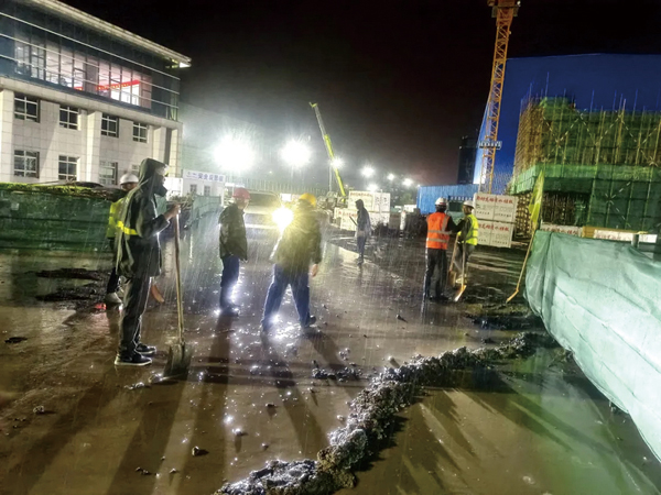 麵對狂風驟雨增添安全隱患的現實,該項目部突擊隊員們連夜在暴雨中進行“無死角”排查,為每一台“電疙瘩”包裹雨衣,確保電氣設備不受潮濕侵害。夜幕中,大家搬機器、扛沙袋,對基坑圍護進行加固,同時通過增設排水溝與沙袋圍堰,有效引導雨水流向指定排水係統,減少積水對地基的侵蝕。經過6小時不間斷奮戰,大家泡白了手指、磨破了肩膀、充滿了疲憊,但臉上還是洋溢著勝利後的喜悅和自豪。