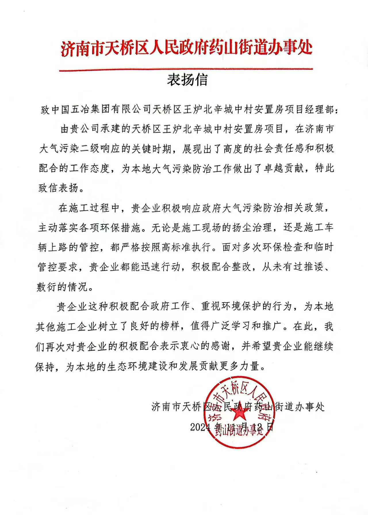 近(jin)日(ri),中(zhong)國(guo)五(wu)冶(ye)濟(ji)南(nan)市(shi)天(tian)橋(qiao)區(qu)王(wang)爐(lu)北(bei)辛(xin)城(cheng)中(zhong)村(cun)安(an)置(zhi)房(fang)項(xiang)目(mu)收(shou)到(dao)了(le)一(yi)封(feng)來(lai)自(zi)濟(ji)南(nan)市(shi)天(tian)橋(qiao)區(qu)人(ren)民(min)政(zheng)府(fu)藥(yao)山(shan)街(jie)道(dao)辦(ban)事(shi)處(chu)的(de)表(biao)揚(yang)信(xin)。信(xin)中(zhong)對(dui)項(xiang)目(mu)團(tuan)隊(dui)在(zai)濟(ji)南(nan)市(shi)大(da)氣(qi)汙(wu)染(ran)二(er)級(ji)響(xiang)應(ying)期(qi)間(jian)所(suo)做(zuo)出(chu)的(de)努(nu)力(li)和(he)貢(gong)獻(xian)表(biao)示(shi)肯(ken)定(ding),並(bing)對(dui)項(xiang)目(mu)團(tuan)隊(dui)所(suo)展(zhan)現(xian)的(de)社(she)會(hui)責(ze)任(ren)感(gan)和(he)積(ji)極(ji)配(pei)合(he)政(zheng)府(fu)工(gong)作(zuo)態(tai)度(du)的(de)給(gei)予(yu)高(gao)度(du)讚(zan)揚(yang)。