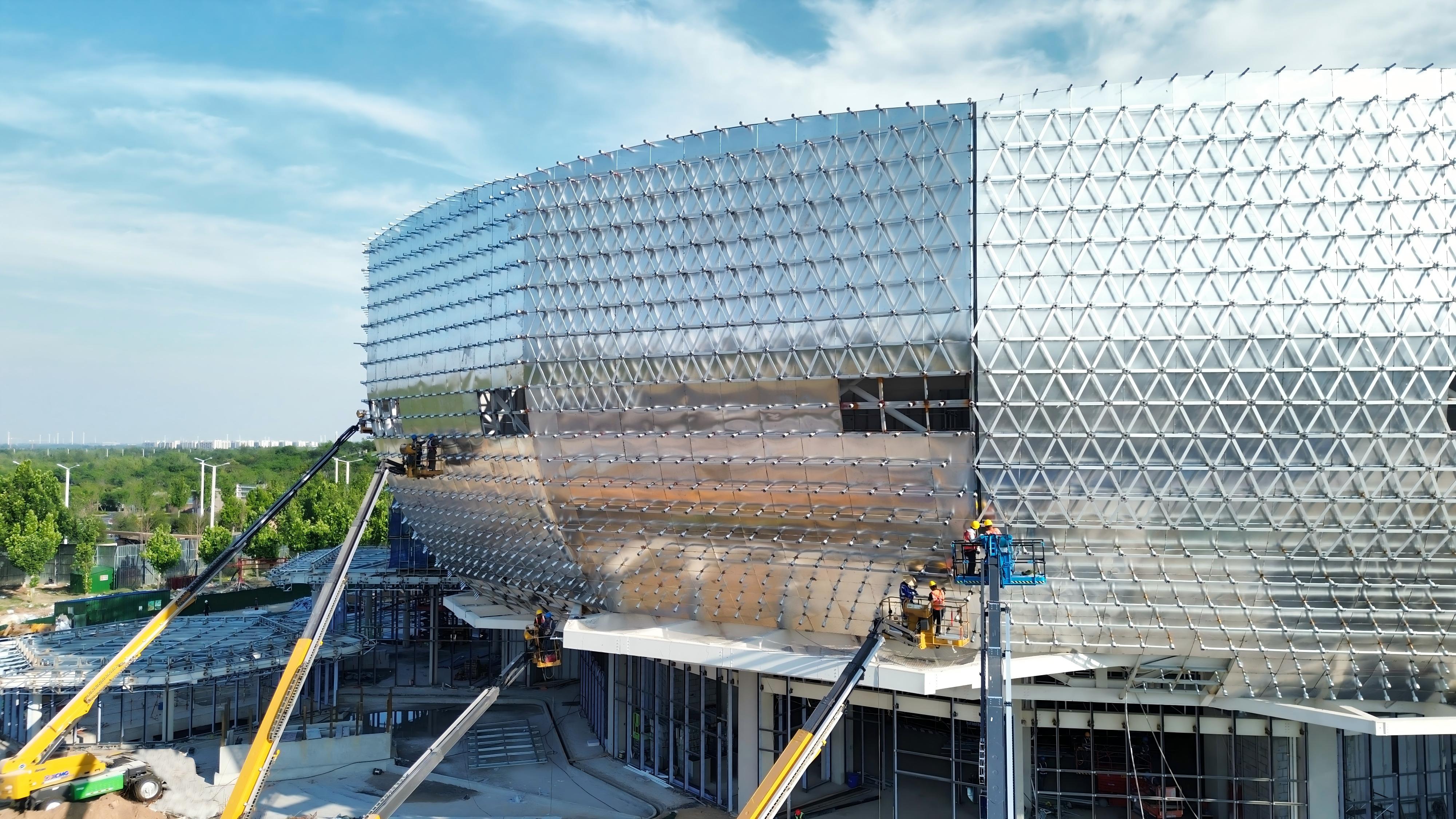 為了最高精度還原圖紙,中國五冶集團項目團隊運用數字化3D建模技術進行參數化設計,精準指導鋼構件生產和幕牆單元板加工安裝,將曲麵外形拆解為標準化單元,采用“編身份證號”的方法,讓1.4萬片三角鋁板的進場安裝不出差錯,團隊還采用數控全站儀激光糾偏與機器視覺動態監測技術,實現了項目毫米級精度安裝,讓“蓮花”外觀完美呈現。