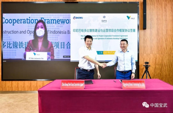 6月24日,《印尼巴哈多比鎳鐵建設與運營項目合作框架協議(PCFA)》在上海、印尼雅加達同步簽署。中國寶武太鋼集團、淡水河穀印尼公司和鑫海科技將攜手建設和運營位於印尼中蘇拉威西省莫羅瓦利縣的鎳鐵項目。中國寶武黨委書記、董事長陳德榮,淡水河穀首席執行官柏安鐸和鑫海科技董事局主席王文光出席簽約儀式並致辭。太鋼集團總經理魏成文、鑫海科技董事長王文龍、淡水河穀印尼公司首席執行官費布莉亞妮·艾迪分別代表三方簽署框架協議。