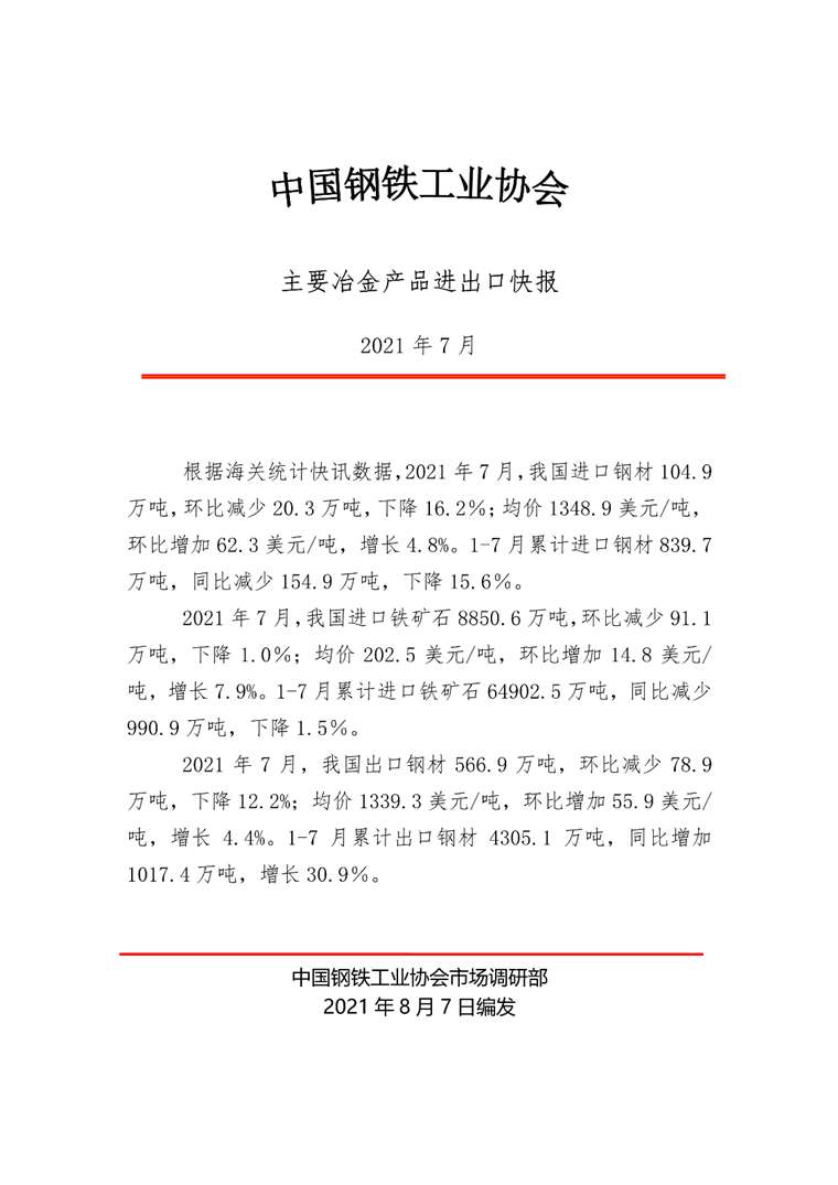 2021年7月主要冶金產品進出口快報
