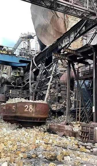 圖2捷克一鋼廠2000m3高爐頂燃式熱風爐於2021年12月初發生的驚天爐體大爆炸安全事故,爐殼炸開一個麵積約100-150平方米的大洞,熱風爐蓄熱室數百噸1000多攝氏度高溫大牆磚和格子磚被炸出體外。