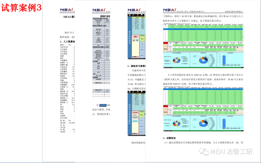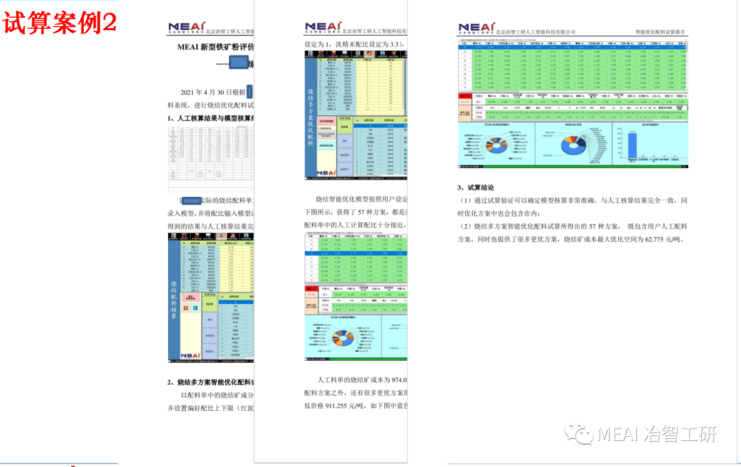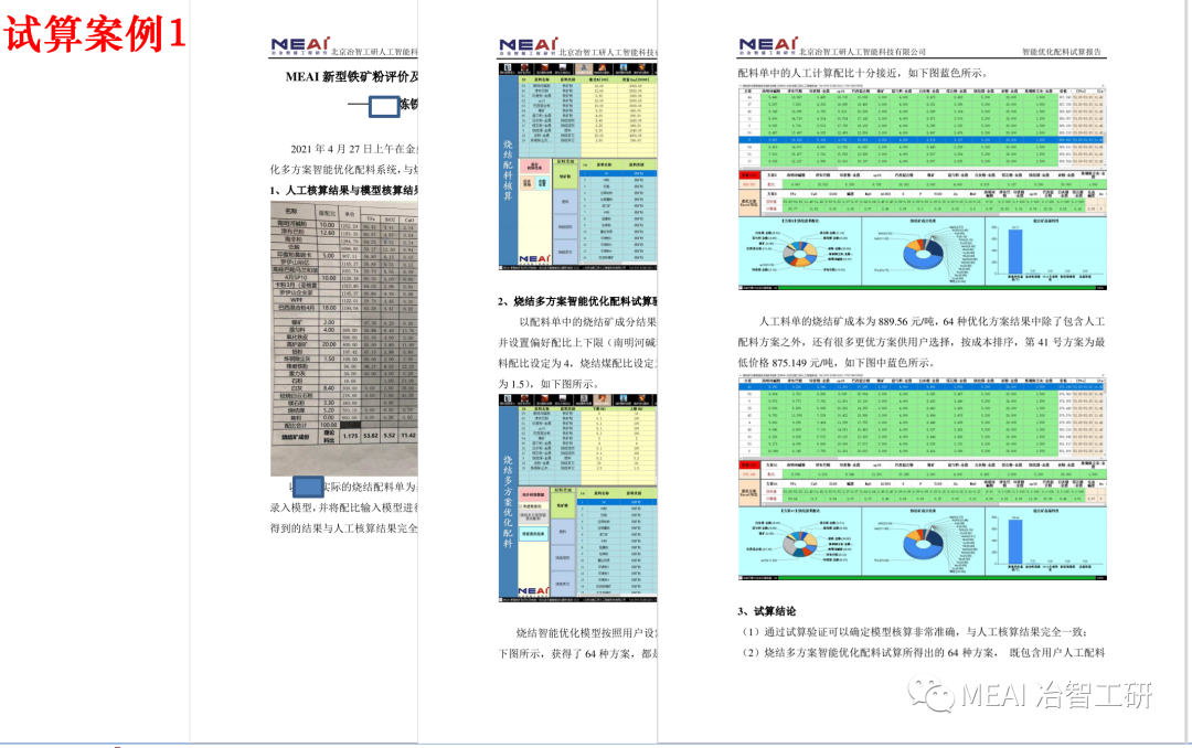 該係統已在多家鋼鐵企業進行了應用試算(部分試算案例如下圖所示),應(ying)用(yong)試(shi)算(suan)采(cai)用(yong)現(xian)場(chang)人(ren)工(gong)配(pei)料(liao)單(dan)對(dui)應(ying)的(de)原(yuan)燃(ran)料(liao)數(shu)據(ju),錄(lu)入(ru)係(xi)統(tong)後(hou)按(an)照(zhao)相(xiang)同(tong)的(de)目(mu)標(biao)要(yao)求(qiu)進(jin)行(xing)優(you)化(hua)配(pei)料(liao),確(que)定(ding)符(fu)合(he)當(dang)前(qian)生(sheng)產(chan)狀(zhuang)況(kuang)可(ke)執(zhi)行(xing)的(de)方(fang)案(an),並(bing)與(yu)人(ren)工(gong)配(pei)料(liao)成(cheng)本(ben)進(jin)行(xing)比(bi)較(jiao),確(que)定(ding)成(cheng)本(ben)優(you)化(hua)空(kong)間(jian),實(shi)際(ji)應(ying)用(yong)情(qing)況(kuang)總(zong)結(jie)如(ru)下(xia):