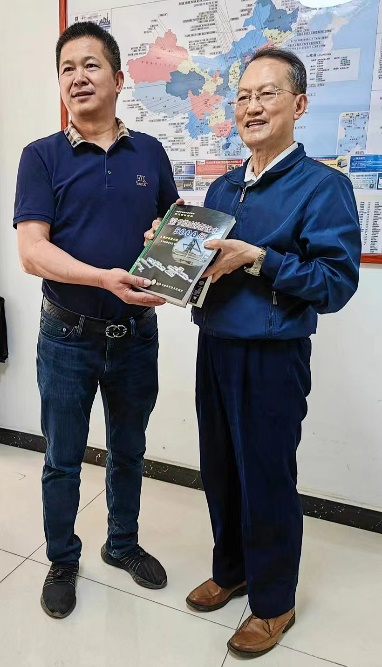 采訪結束後,記者夏傑生代表中國冶金報社向仙福鋼鐵煉鐵廠贈送本社編輯出版的大型冶金科普圖書《鋼鐵工業節能減排新技術5000問》。(左)為仙福鋼鐵煉鐵廠常務副廠長李風寶。(周紅朝 攝影)