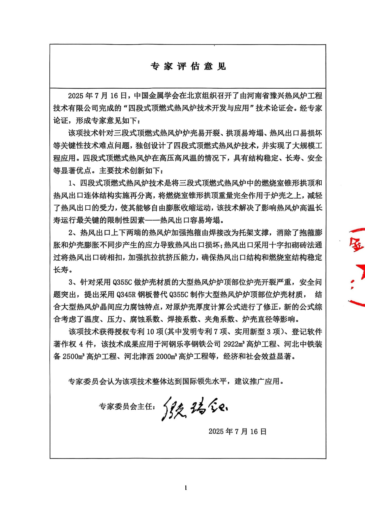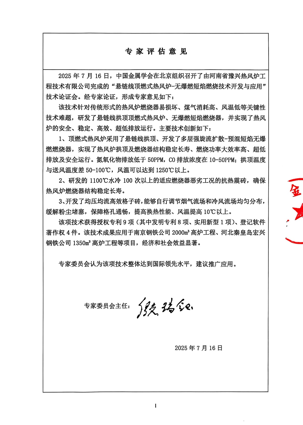 2025年7月16日,中國金屬學會在北京組織召開技術論證會,對河南省豫興熱風爐工程技術有限公司(下文簡稱豫興公司)完成的,“懸鏈線頂燃式熱風爐-無爆燃短焰燃燒技術開發與應用”、“四段式頂燃式熱風爐技術開發與應用”,以及“外燃式熱風爐改造為頂燃式熱風爐技術開發與應用”這三項成果進行評審,並展開深入論證。專家們得出的一致結論是:這三項豫興頂燃式熱風爐技術推廣前景廣闊!