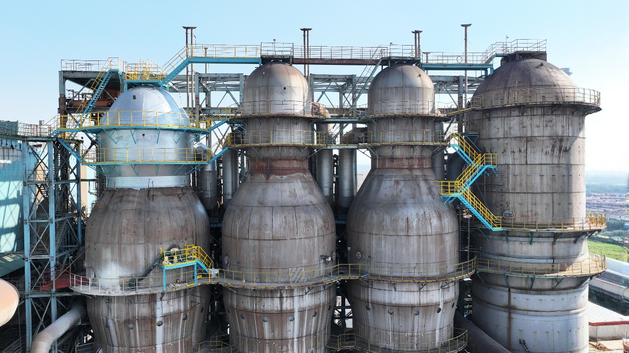 圖為河鋼集團樂亭鋼鐵公司新建4座2922m³高爐12座采用豫興四段式頂燃式熱風爐技術的熱風爐群