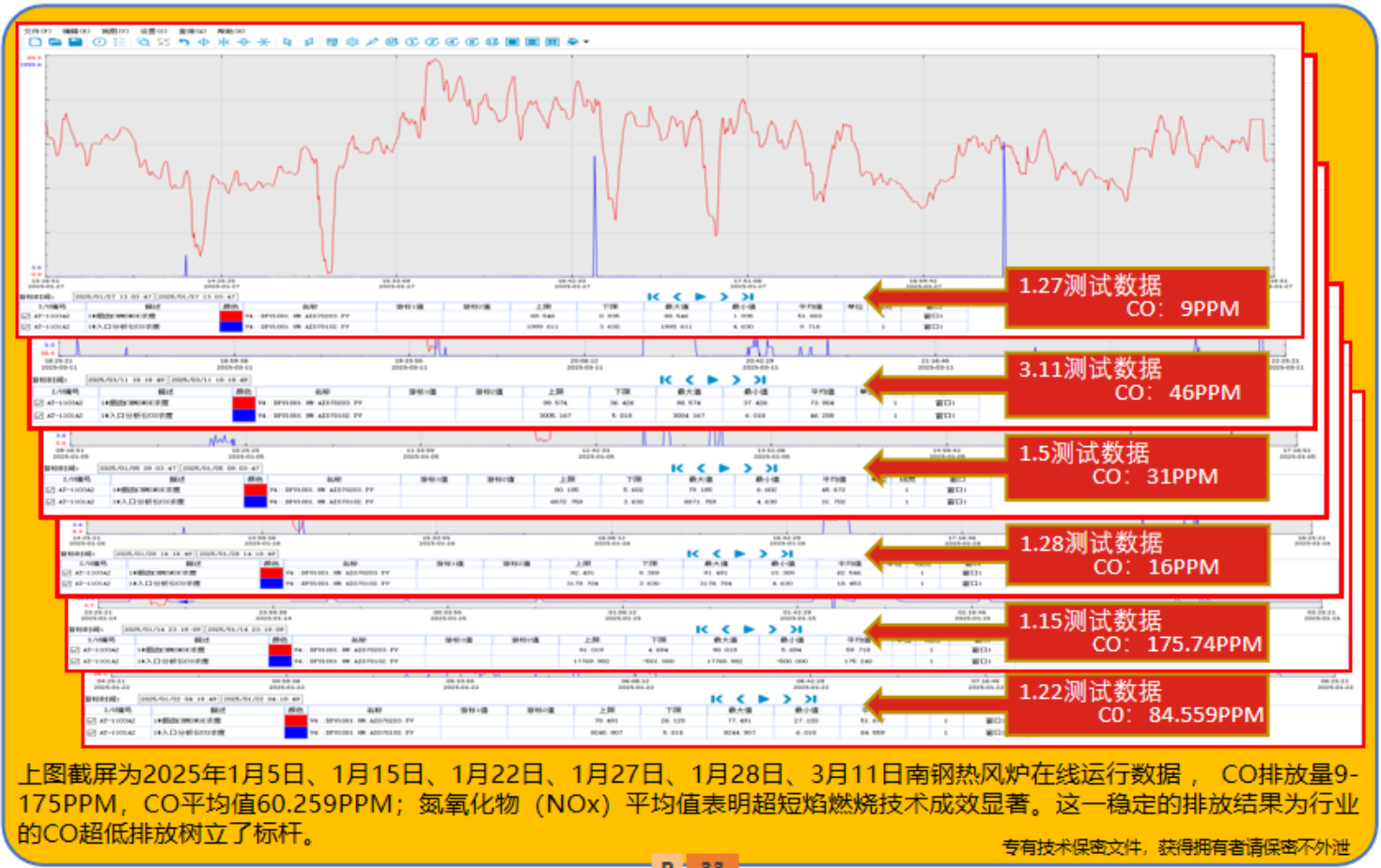 這些優化改造項目都是在2017年~2024年之間,在全國各地的煉鐵廠高爐熱風爐上完成的。例如,山西建龍1380m³、山西中陽1200m³、南鋼2000m³、廣東韶鋼3200m³、鞍鋼朝陽2650m³等(deng)多(duo)座(zuo)高(gao)爐(lu),均(jun)是(shi)采(cai)用(yong)內(nei)燃(ran)式(shi)熱(re)風(feng)爐(lu)爐(lu)殼(ke)利(li)舊(jiu)的(de)懸(xuan)鏈(lian)線(xian)頂(ding)燃(ran)式(shi)改(gai)造(zao)。其(qi)燃(ran)燒(shao)器(qi)改(gai)造(zao)方(fang)法(fa)也(ye)不(bu)盡(jin)相(xiang)同(tong),風(feng)溫(wen)和(he)排(pai)放(fang)也(ye)存(cun)在(zai)差(cha)異(yi)。但(dan)其(qi)改(gai)造(zao)效(xiao)果(guo)有(you)口(kou)皆(jie)碑(bei):南鋼截屏CO排放值,第三方現場儀表測試幾乎為零;山西中陽改造工程出具的使用報告CO小於0.2PPM;甘肅蘭州皋蘭1080m³、河北秦皇島宏興1080m³、河北華西2000m³等多座高爐熱風爐煙氣中測試的排放指標也小於20~300PPM。
