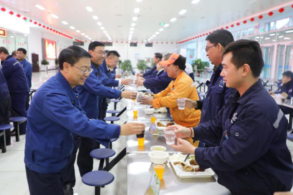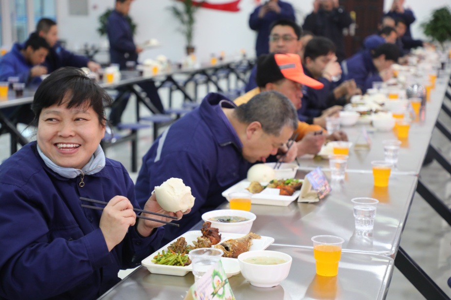 隨後,黨錫江等公司領導帶領幹部們來到用餐員工麵前,一一和就餐員工碰杯祝福,“大家辛苦了,祝願大家幸福安康,祝大家生活越來越好”,溫馨、暖nuan心xin的de問wen候hou在zai餐can飲yin中zhong心xin大da廳ting裏li回hui蕩dang。員yuan工gong們men紛fen紛fen起qi立li表biao示shi感gan謝xie,熱re情qing回hui應ying著zhe新xin年nian的de祝zhu福fu。黨dang錫xi江jiang等deng還hai來lai到dao回hui民min餐can廳ting,向xiang少shao數shu民min族zu員yuan工gong和he炊chui事shi員yuan們men表biao達da了le新xin年nian的de祝zhu福fu。“心裏好暖呀!謝謝領導們的關心!”“太激動了,比在家裏過得還火紅”“飯菜豐富極了,雖然沒有和家人一起度過除夕夜,但一樣感受到了家的溫暖”……許多員工向工作人員表達了自己的心情。