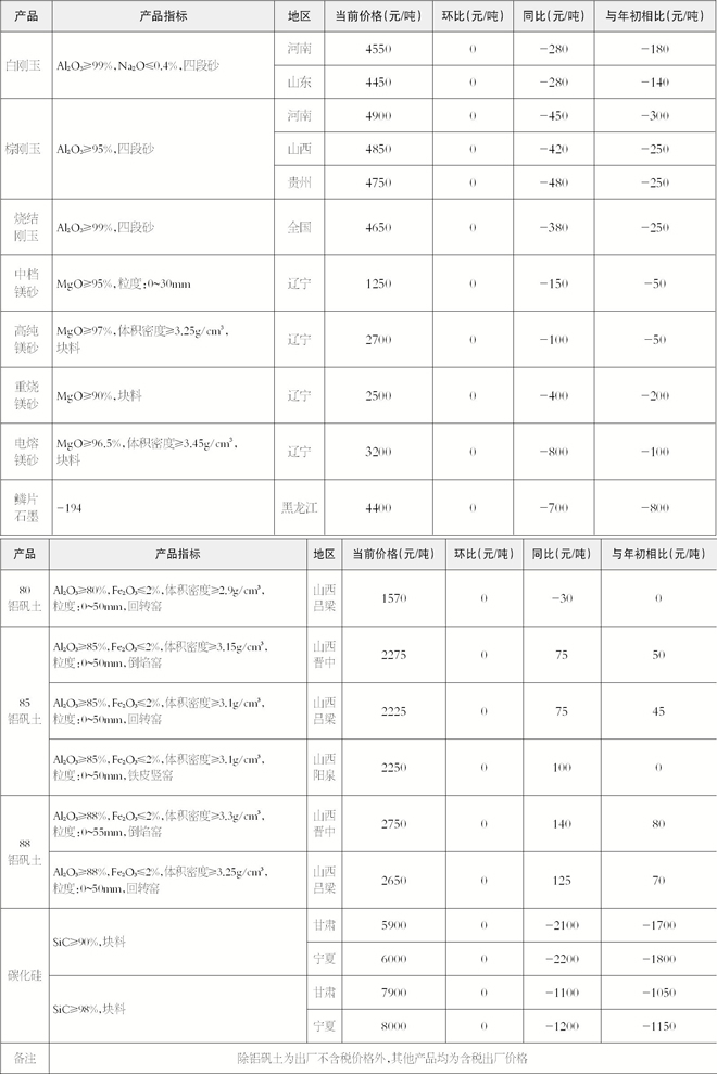 燒結鎂砂、電熔鎂砂價格弱勢運行,終端需求低迷,鎂砂供需失衡嚴重,停產、限產鎂砂企業數量有所增多。