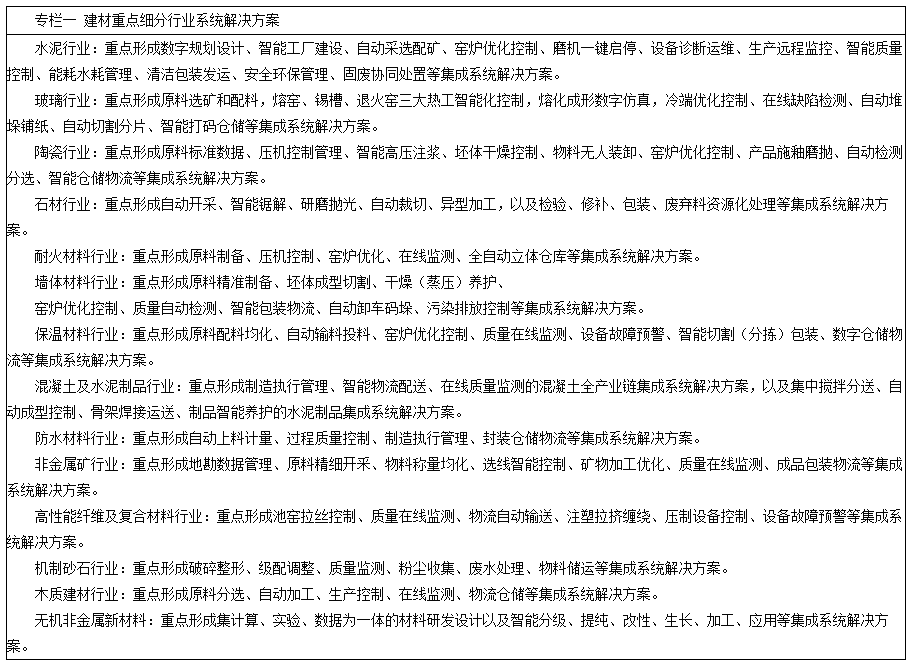 6.形成一批係統解決方案。針對建材細分行業特點,以礦山開采、原料製備、破碎粉磨、窯爐控製、物流倉儲、在線檢測等關鍵環節為重點,提煉形成若幹套具有智能感知、自動執行、深度學習、智能決策、密碼防護等功能的智能化、數字化、集成化係統解決方案,促進水泥、玻璃、陶瓷等行業生產方式的自動化、智能化、無人化變革。