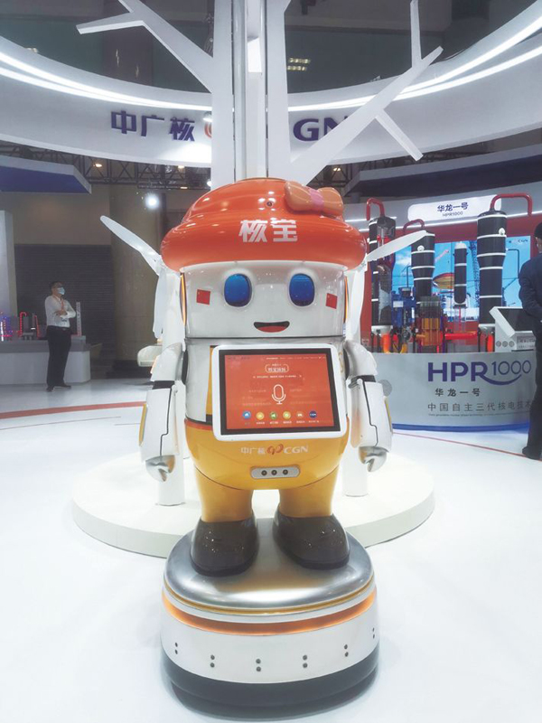 “核寶妹妹”是此次亮相的中國廣核集團有限公司的智能科普機器人,萌趣可愛的外形在展廳中央十分吸睛。“核寶妹妹”的肚腩上有一個顯示屏,上邊羅列著她所具備的核電科普、展廳講解、輻射檢測、遊戲互動、關於中廣核等多個功能分類,公眾隻要說出喚醒口令“核寶妹妹”4個字就可以與她互動了。