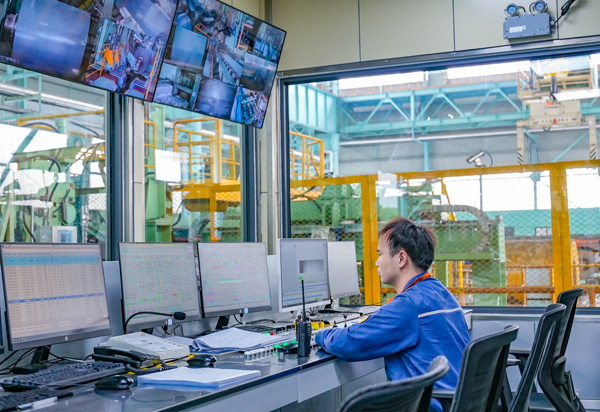 圖為工作人員通過成本可視化係統實時監控冷軋機組生產。 (梅鋼 供圖)