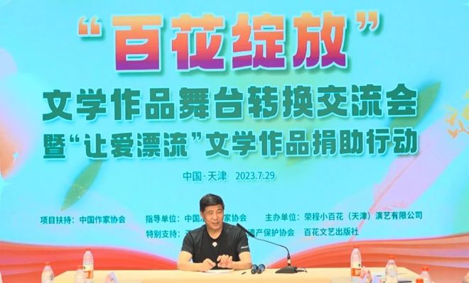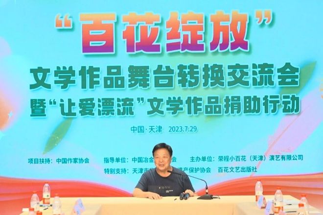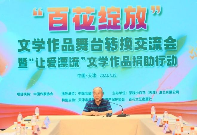 2023年7月29日上午,由中國作家協會項目扶持,冶金文學藝術協會、中國冶金作家協會指導,天津市非物質文化保護協會,百花文藝出版社特別支持,榮程小百花(天津)演藝有限公司主辦開展的“百花綻放”文學作品舞台轉化交流會暨“讓愛漂流”文學作品捐助行動在天津榮程小百花劇場圓滿舉辦。