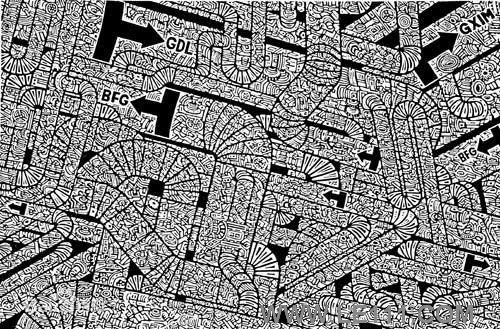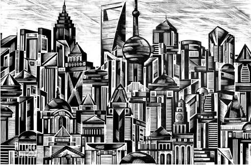 沈有福的版畫以表現工業題材而著稱。此作中我們可以看到不同種類、型號的工業管件、器具。它們的形狀千差萬別,構成了別具一格的視覺印象。畫麵黑白關係生動複雜,細節豐富耐看,形式上也較為整體統一。