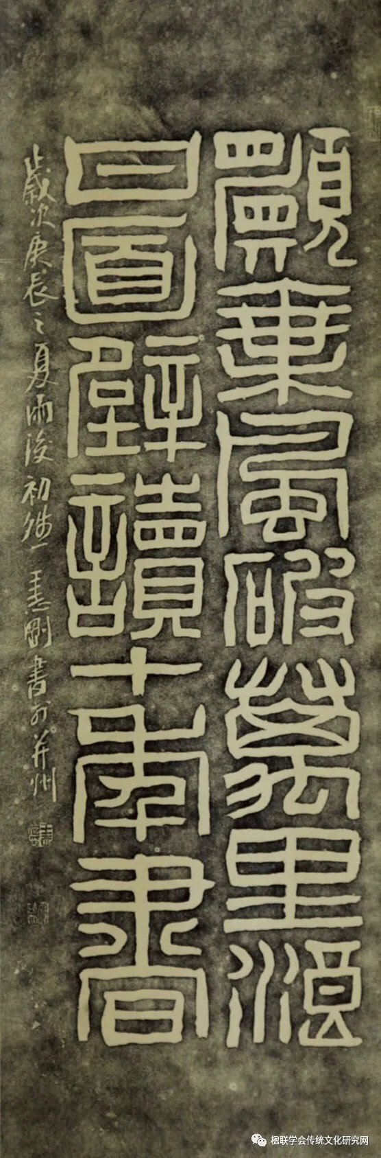 千qian年nian書shu法fa,但dan凡fan留liu有you足zu跡ji者zhe皆jie遺yi個ge性xing符fu號hao。然ran所suo謂wei創chuang新xin絕jue非fei玩wan弄nong小xiao聰cong明ming小xiao技ji巧qiao,惟wei有you將jiang前qian賢xian宗zong師shi之zhi書shu風feng筆bi格ge爛lan熟shu於yu心xin,潛qian移yi默mo化hua為wei己ji之zhi精jing神shen,方fang能neng有you所suo感gan悟wu,方fang敢gan談tan及ji創chuang新xin。誌zhi剛gang兄xiong即ji如ru此ci。其qi天tian賦fu異yi稟bing,且qie臨lin池chi不bu輟chuo,習xi篆zhuan治zhi印yin數shu十shi載zai,孜zi孜zi矻矻矻矻,苦ku心xin孤gu詣yi,大da有you成cheng就jiu。近jin年nian來lai又you苦ku苦ku探tan求qiu,融rong篆zhuan隸li筆bi意yi與yu簡jian帛bo趣qu味wei為wei一yi體ti之zhi新xin篆zhuan書shu,且qie始shi有you麵mian目mu,值zhi得de稱cheng道dao也ye。 文/趙國柱