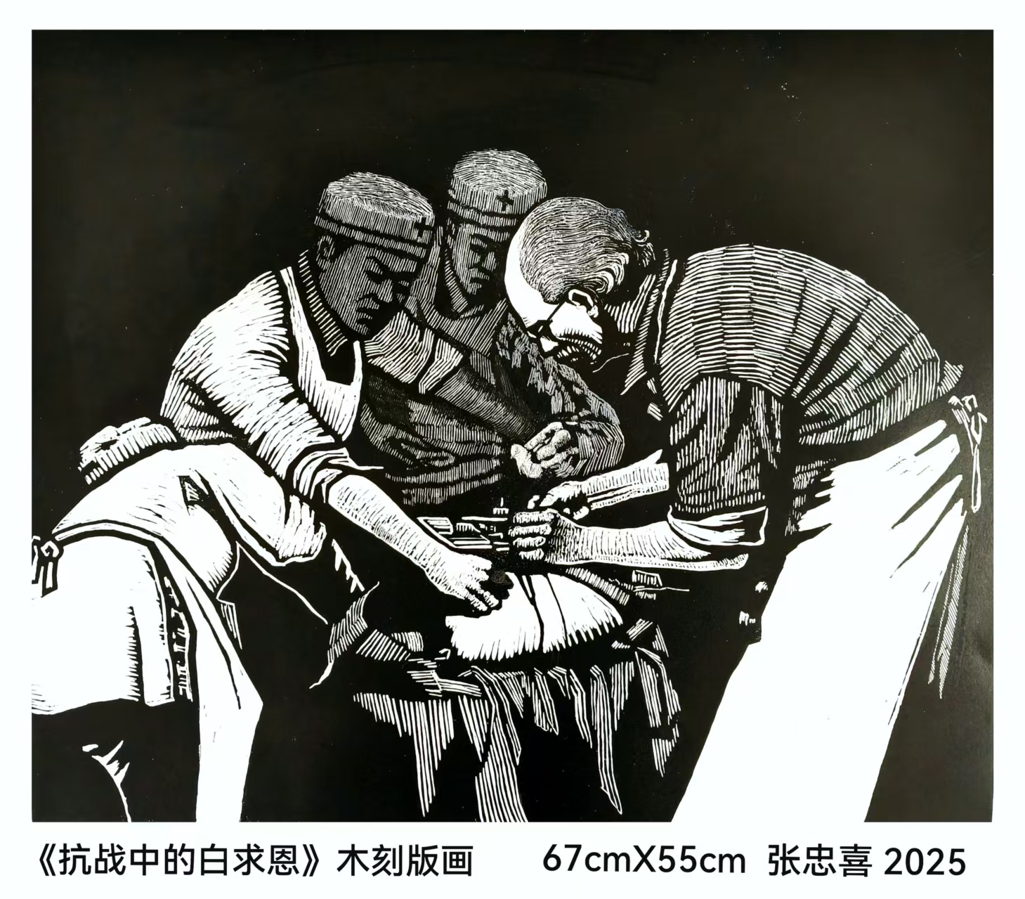 《抗戰中的白求恩》版畫 張忠喜 (寶武武鋼)
