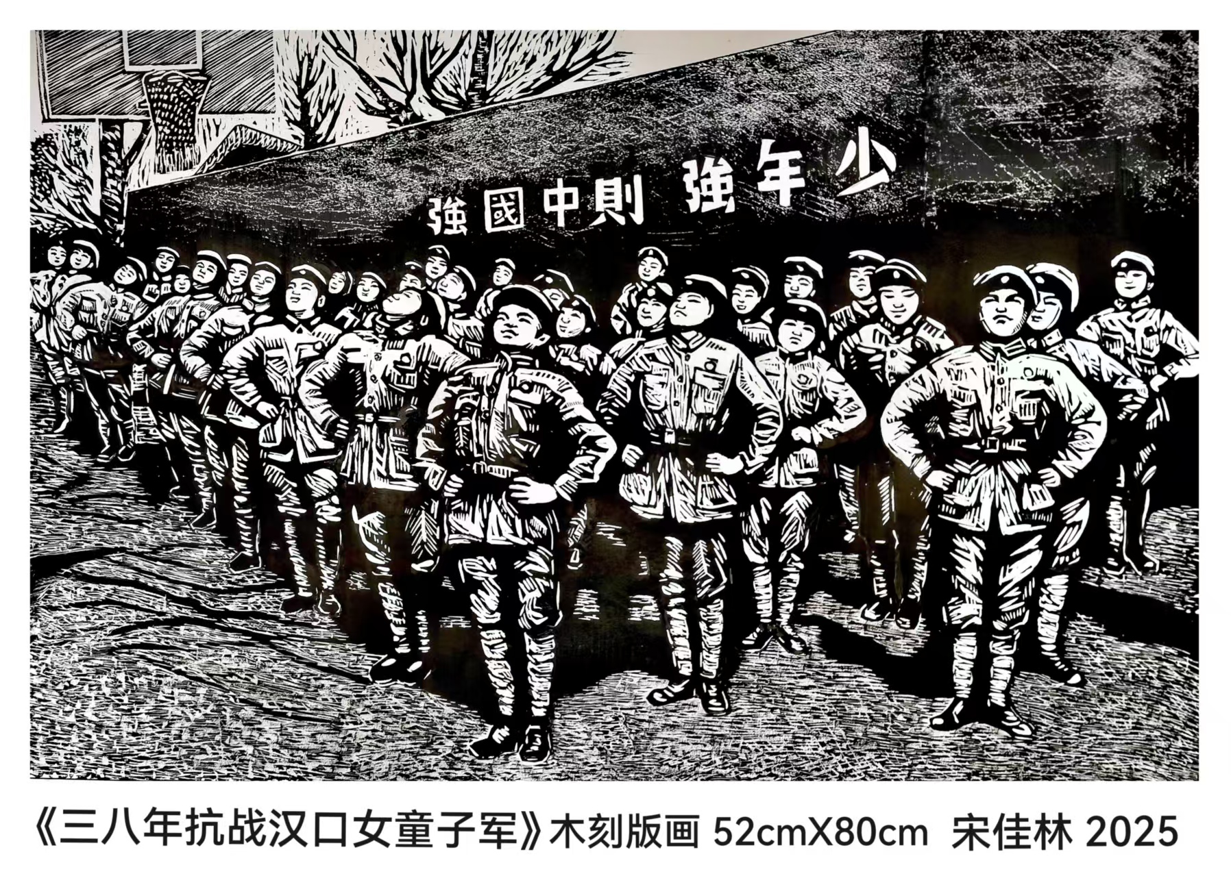 《三八年漢口抗戰女童子軍》版畫 宋佳林 (寶武武鋼)