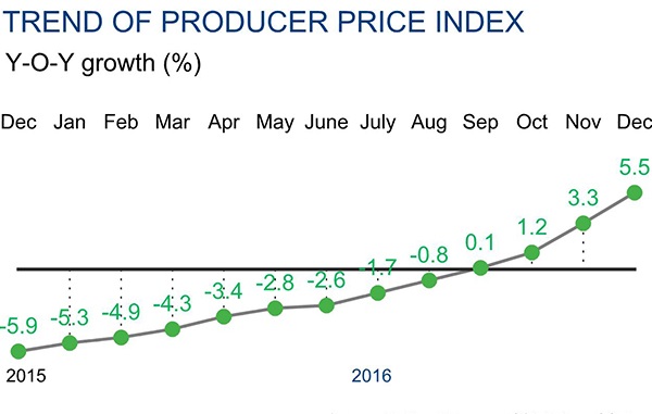China's producer price index (PPI), which measures costs for goods at the factory gate, continued its growth by rising 1.6 percent month-on-month in December, official data showed Tuesday.