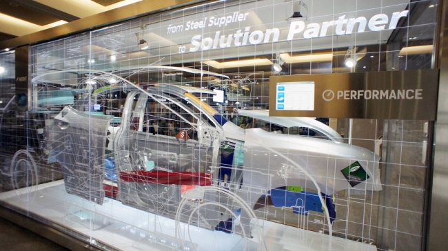 POSCO’s self-developed automotive steel plate is displayed at North American International Auto Show in Detroit in January. (POSCO)