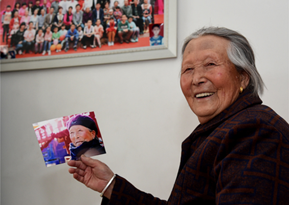 畫麵中這位老人叫陳福姐,是山西婁煩縣馬家莊鄉河北莊村村民。她手舉的這張照片是《中國冶金報》特約通訊員在2009年11月23日抓拍的。當天,太鋼向山西貧困縣婁煩縣捐贈1萬噸原煤,陳福姐老人看到開進村裏的運煤車後,不禁開心地笑了。