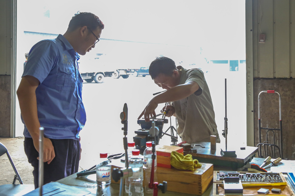 7月10日,遼寧省工會職工職業技能提升工作三年行動暨送技能進企業活動走進淩鋼。方文墨、曲驪、劉宇誌、何宇輝、孫誌強、黃海泳6名全國頂級專家為該公司焊、鉗、電專業技術工人進行現場指導培訓。圖為方文墨正在一對一指導青年鉗工實際操作。 (特約通訊員 曹鳳友 攝)