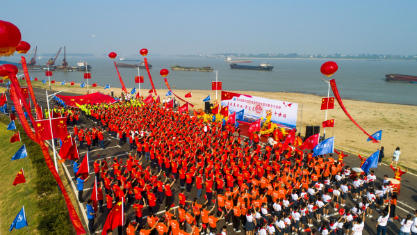 方大九鋼此次活動以“看最美岸線,賞生態工廠,慶七十華誕”為主題,舉辦千人健步行,共有方大九鋼員工、員工家屬和研學小記者、jiujiangyuhukoupaotuansanzhiduiwu,fenbiecongsantiaoluxiantubuhuozhepaobuxingjinzhichangjiangzuimeianxian,ganshouqiyehuanjingdejubian,linglveyanjianganxiandexiumeifengguang,yilufenjin,yilugaoge。sanzhiduiwuhuishihoutongchang《我和我的祖國》,齊聲高喊“祖國,我愛您!祝您生日快樂”!現場壯觀熱烈。