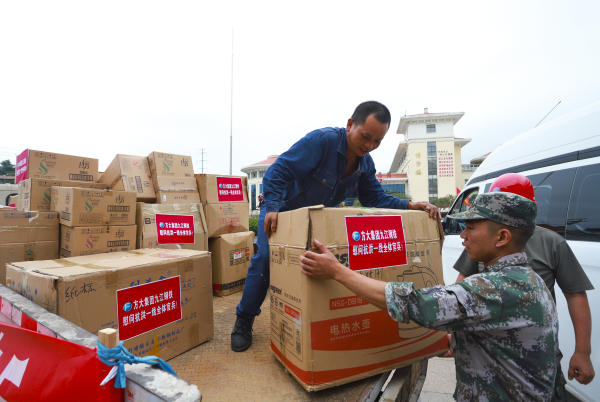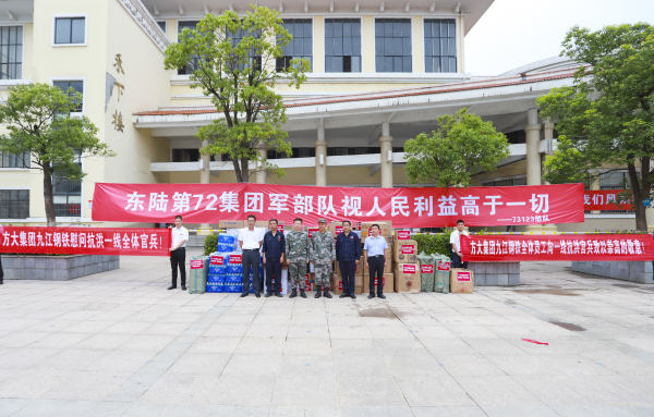 7月15日,方大九鋼董事長顏建新、黨委書記徐向陽率隊,到馳援湖口的東陸第72集團軍相關部隊駐地進行慰問,主動為官兵送去了1200份牙膏、牙刷、毛巾、沐浴露等生活物資以及麵包、水等1200份幹糧,價值3萬餘元。