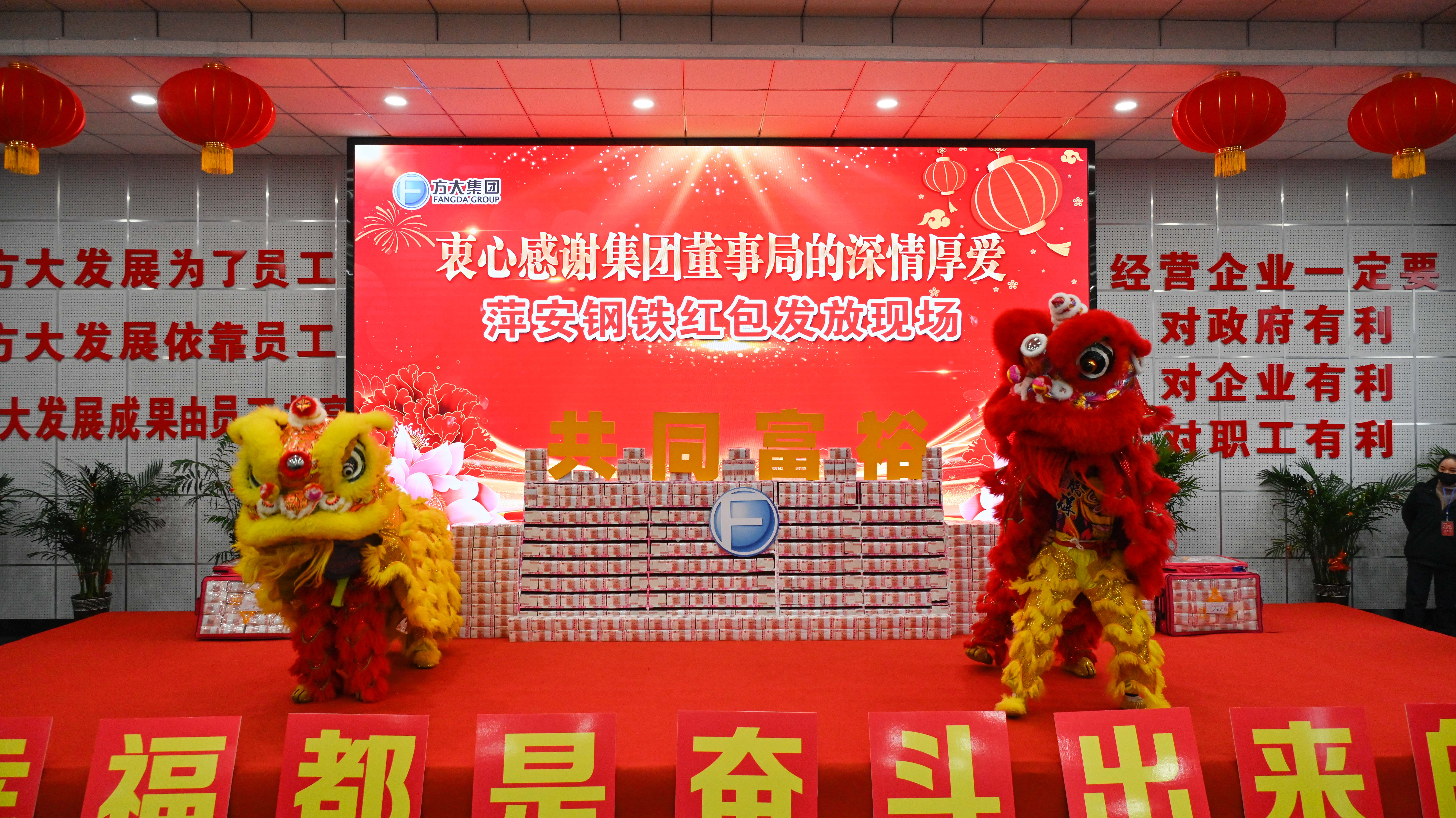 虎年新春即將來臨之際,1月27日,萍安鋼鐵公司廠區內到處洋溢著喜氣洋洋的氛圍。在方大集團董事局方威主席的建議下,該公司為每名員工發放1萬元大紅包。這個紅包,既是方大集團送給萍安鋼鐵7000多名員工的特殊關愛“年禮”,更是對廣大員工接續奮鬥“十四五”助力“鋼鐵強國”夢的激勵!
