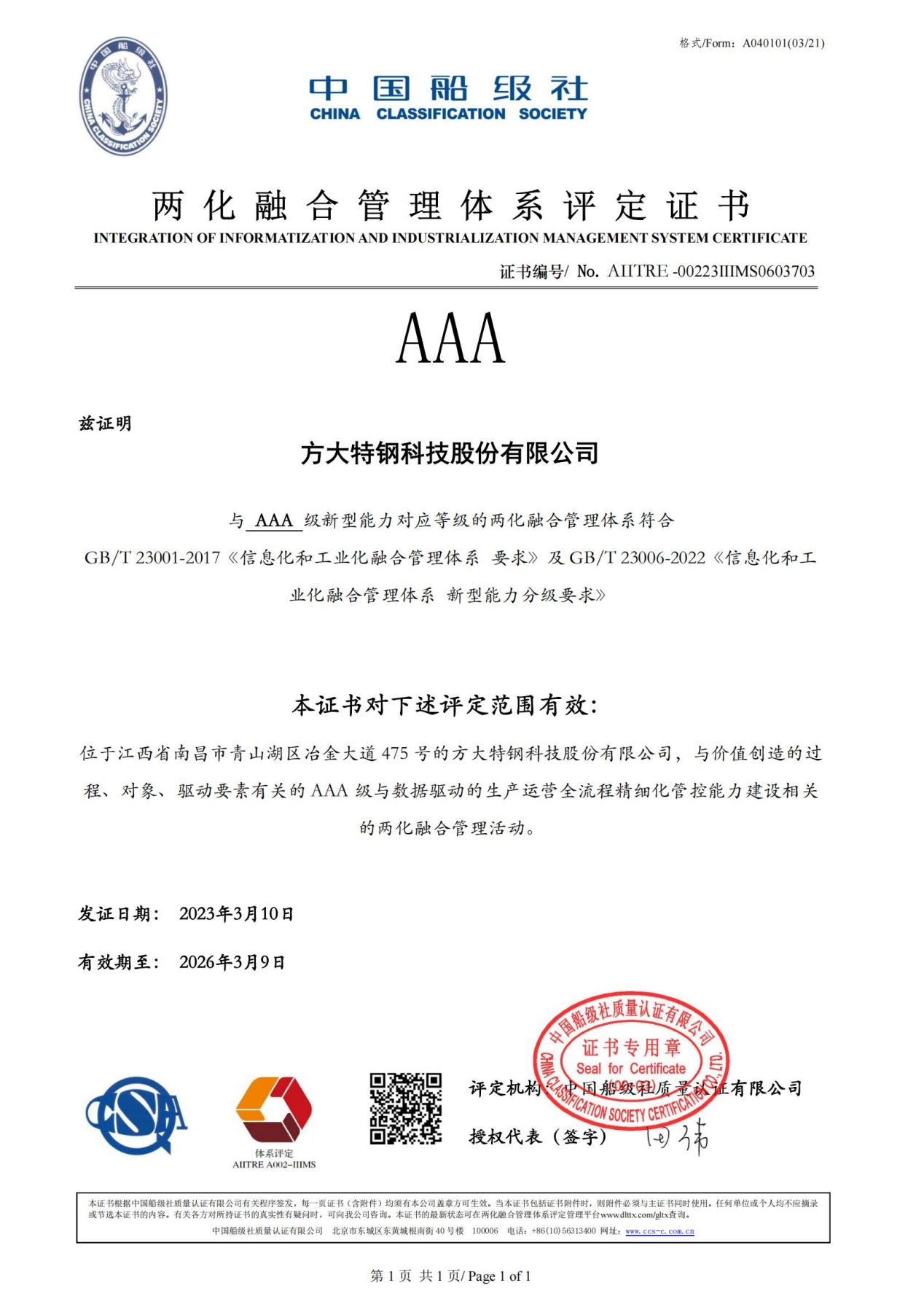 兩化融合管理體係貫標由國家工業和信息化部直接推動,AAA級認證是目前兩化融合管理體係可申請的最高認證等級。方大特鋼相關負責人表示,本次取得“兩化融合管理體係AAA級評定證書”是企業“穩步推進兩化融合”戰略的重要成果之一,有利於公司加快組織管理變革、促進公司提質降本增效、夯實公司低碳低耗基礎、利用數字技術提升核心競爭力。