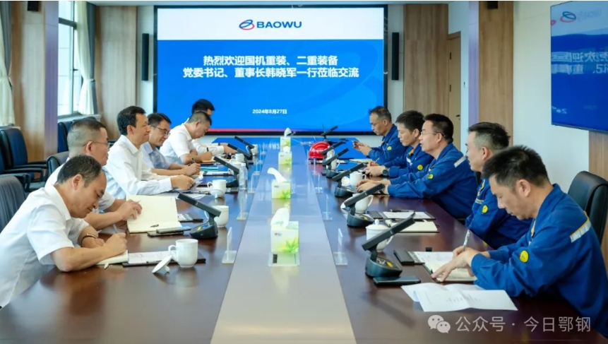 8月28日,國機重型裝備集團、二重重型裝備黨委書記、董事長韓曉軍一行來訪。鄂城鋼鐵公司領導陸隆文、黃大軍、徐東明與客人座談交流,雙方就加強厚板備件、連鑄等技術設備合作深入交流,實現雙方更高水平的價值創造、合作共贏。