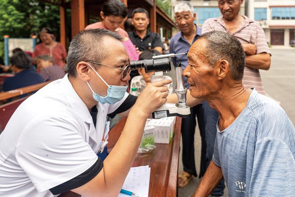 圖為馬鞍山總醫院眼科醫生正在給定點幫扶村的老人檢查眼角膜健康情況。