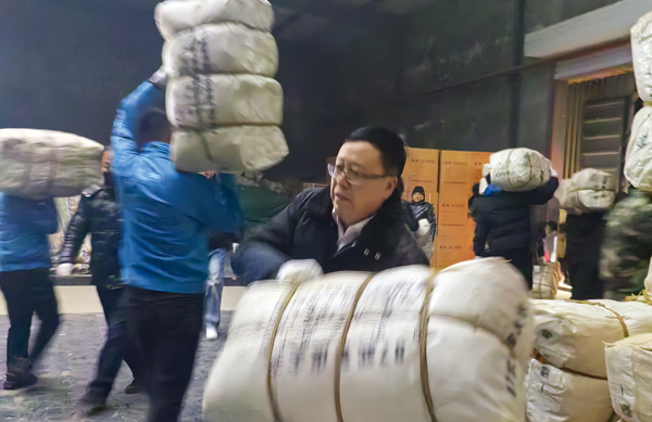 圖為新興際華7555公司緊急將10000床棉被出庫裝車準備運往災區。
